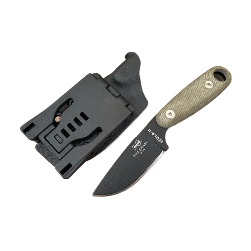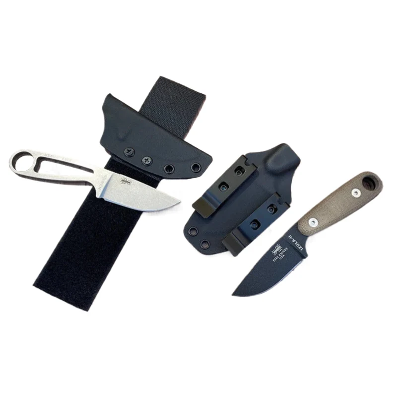 شکاری چاقو کو کلاسک طریقے سے بیلٹ سے جوڑنے کے لیے، افقی یا عمودی طور پر، میرے گاہک عام طور پر ملٹی لوک کا انتخاب کرتے ہیں۔ اگر آپ چاقو کو تھوڑا نیچے لے جانا چاہتے ہیں، تو میں تجویز کرتا ہوں کہ Kydex ہولڈر کے ساتھ نایلان کا پٹا لگائیں۔ کلپس یا ویلکرو چاقو کو بیلٹ پر لے جانے کے لیے مثالی ہیں۔ ویلکرو بھی چاقو کو بیگ کے پٹے سے جوڑنے کا ایک عملی حل ہے۔ Kydex میان کے علاوہ، میں فائر اسٹیل ہولڈر کو جوڑ سکتا ہوں، اختیاری طور پر فائر اسٹیل (80 ملی میٹر لمبا) کے ساتھ۔ عام، خاموش رنگوں میں دستیاب ہے جیسے: براؤن، کویوٹ براؤن، ریت اور زیتون۔ اگر آپ کے پاس دوسرے رنگوں، نمونوں، اپنی Kydex میان کے لیے آپ کی اپنی خواہشات یا میرے لیے سوالات کے حوالے سے کوئی درخواست ہے تو مجھے لکھیں۔